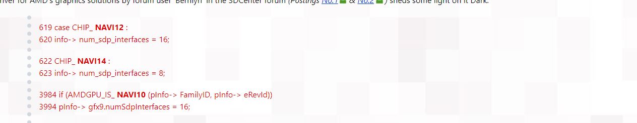 In the case of Navi 10, it is NUM_SDP_INTERFACES = 16, whereas Navi 14 is NUM_SDP_INTERFACES = 8. This ties in with the information that Navi 14 is using a 128-bit bus vs the 256-bit bus of Navi 10.