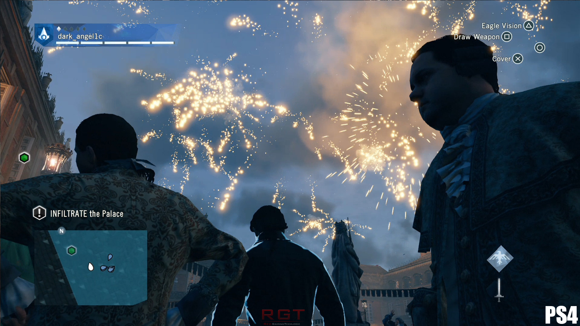 The worst dip we’d seen took the frame rate of the PS4 version all the way to 17 FPS, which is frankly, terrible. This was caused in the cathedral area, with a lot of geometry, smoke bombs going off and in the midst of fighting a rather large crowd of angry guards. The Xbox One version did manage to fair slightly better, holding on to the low 20’s for dear life. The strangest part of all this however are the cutscenes; which have a lower frame rate on the Xbox One compared to that of Sony’s machine. It does appear that particle effects (and other GPU intensive effects) can take a little more out of the X1, but for the most part it still maintains better performance.