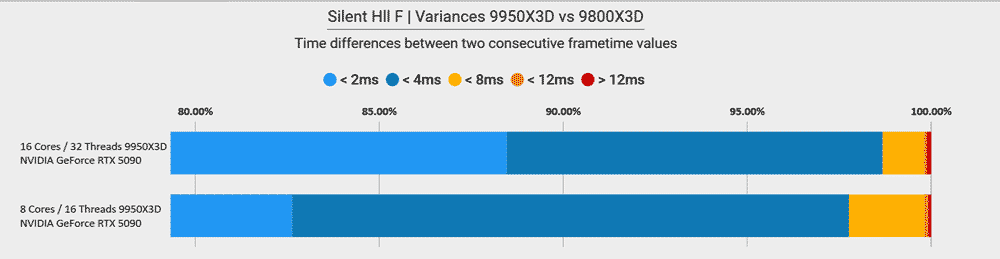 Well, I couldn’t stop quite there – I wanted to see how it would do with fewer threads available on AMD’s Zen 5 platform too. I decided to disable the second CCD, forcing the Ryzen 9 9950X3D to behave more akin to a Ryzen 7 9800X3D (8 Cores / 16 threads with V Cache enabled) and re-run the tests again with the same settings and again, the RTX 5090. Graphs really can’t quite convey the difference, but let’s say it was large. Basically, during shader compilation all cores and threads shot up to 100 percent usage again as you’d expect, but this time without the extra cores to offload work to, Silent Hill F’s stutter was much worse and definitely felt more impactful to gameplay for a moment.
