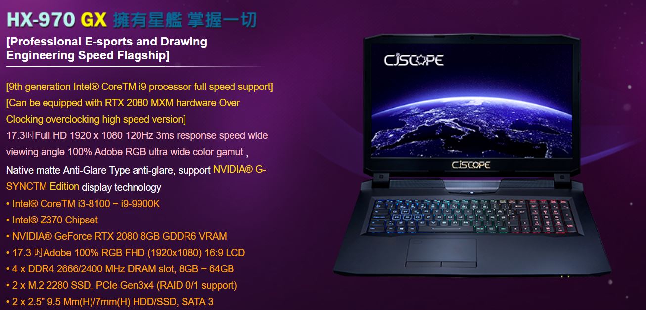 The CJScope laptops will also sport the Intel 9th generation processor architecture and supposedly will see a launch of mid-January, 2019 (that’s apparently the same date as we’ll see the Desktop GeForce RTX 2060 launch too).