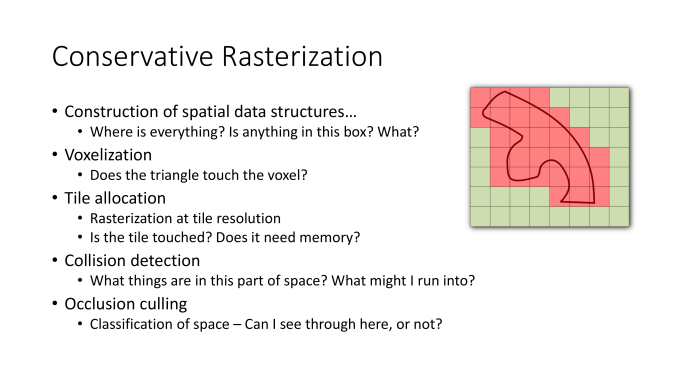 This is all about accuracy, it allows developers to see whether or not a polygon covers part of a pixel. Typically, there’s a quick test that’s performed by the game engine to see if the center of the pixel is ‘bounded’ by the lines from the polygon. Conservative Rasterization is more expensive as instead, it checks versus the corners of the pixel. So, if a polygon didn’t quite meet the center of the pixel, this technique would spot that while otherwise it’d be missed by the regular rasterizer.