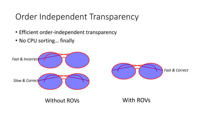 If we’re still using photoshop as an analogy, then think of OIT as blending controls. This allows elements to be blended together for the right result no matter the order they’re created in. Think of it as pouring blue paint in the pot and then yellow, or yellow and then blue. The end result should be the same while mixed. With graphics that’s not always the case, and this helps to control that. DX11 did technically create OIT, but there were major speed issues. While it was great for say CAD (Computer Aided Design work) or high end 3d rendering, it wasn’t really useful to game developers as it had a fairly negative impact on the speed of the scene.