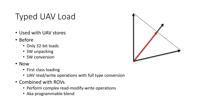 The first new feature to Direct3D we’ll discuss is the rather un-snazzily named Typed UAV Load. UAV’s (Unordered Access Views) are a special type of buffer, which allows you read / write from multiple threads without causing memory issues. This is totally different from say a Pixel Shader which can write to one location per render target (and that is its own corresponding pixel). Typed UAV Load goes ahead and attempts to address issues that are created (mostly restrictions) that’s currently in DX.