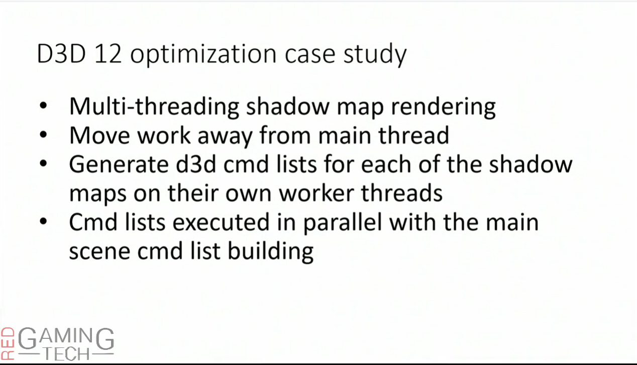 On DX12 the ‘main’ worker thread (rendering thread) builds the main scenes command list (basically, acting as a control) and then the worker threads generate the shadow maps command list. The data is then synced up and then executed. To translate at it’s simplest, the first CPU will run the ‘main’ workload of the graphics engine, and delegate the shadow generation to multiple other cores. These “worker” threads will then generate the commands (instructions) needed to send to the GPU and tell it what to render. Once all of these instructions have been generated, it’s all synced up to be sent to the GPU to execute. With the Shadow Maps being moved away from the ‘main’ thread and to these worker threads, render time dropped down to just 13ms, from the original 23ms – a huge saving of 10ms.