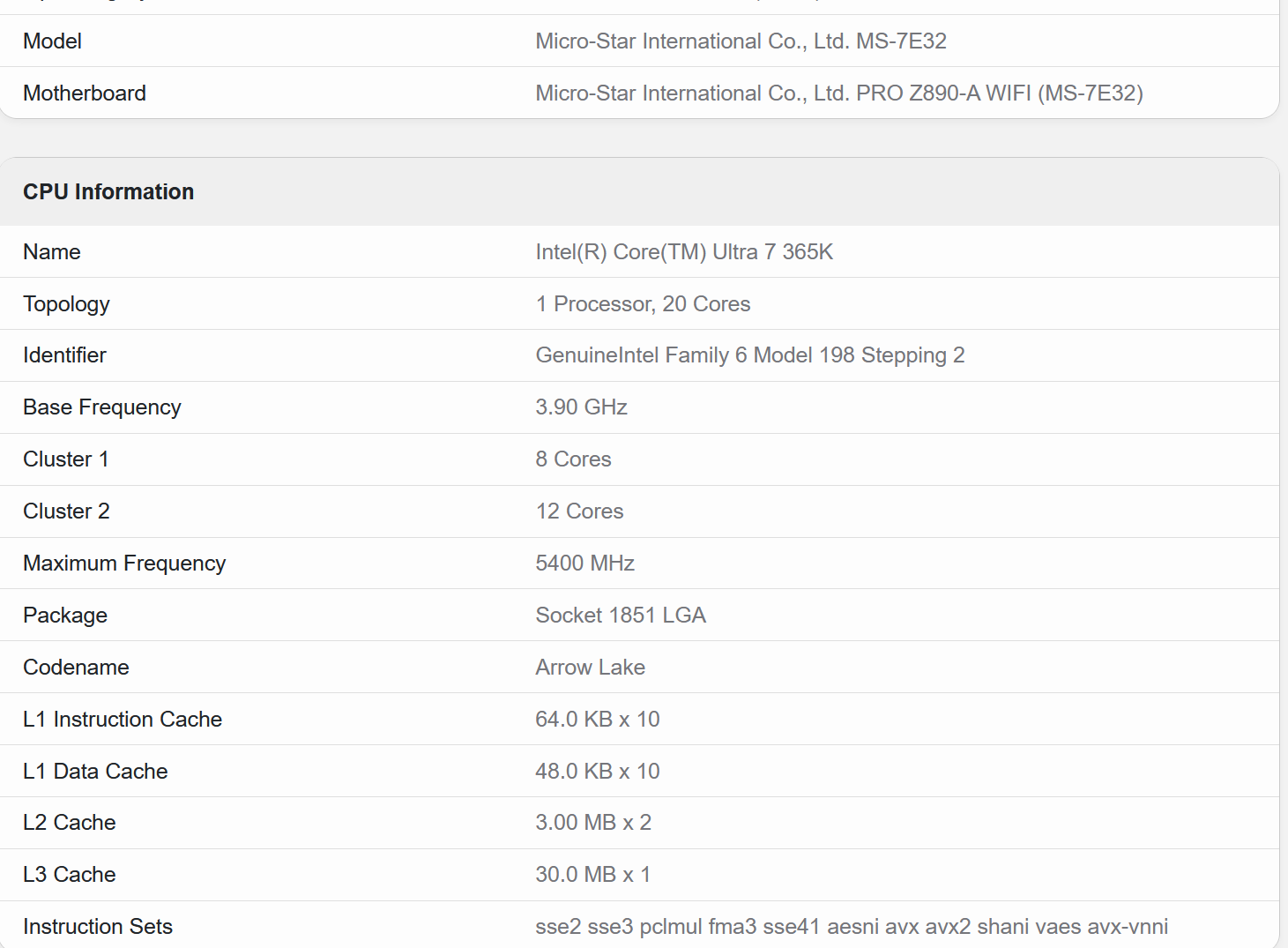 So then, the Intel Ultra 7 365K still sports 8P cores and 12 E cores and the same 30MB of L3 cache returns. Interestingly, the base frequency is reported as 3.9Ghz (again a match to the Core Ultra 7 265K), and the P cores nudge to 5.4GHz.