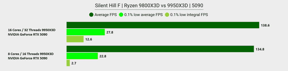 Silent Hill F’s stuttering can only be truly fixed by the developers, but faster CPUs do help. The stuttering is less noticeable the more threads and the higher the IPC you’ve got to work with. While hit with stuttering, the CPU just can’t drive the GPU – and how powerful the GPU is doesn’t matter because data simply isn’t being fed to it. To that end, thread count does win. I noticed during my testing of Silent Hill F that even a Ryzen 7 9800X3D will stutter in the same sections as our ‘I7-8700K’, albeit for less time. A more powerful Ryzen 9 9950X3D minimizes things, though. You can see an example of how the stuttering is affected with a Ryzen 9 9800X3D (by cutting threads of a 9950X3D to only a single CCD) versus the full fledged CPU. Averages over a long gameplay section aren’t dreadfully impacted, but lows are.