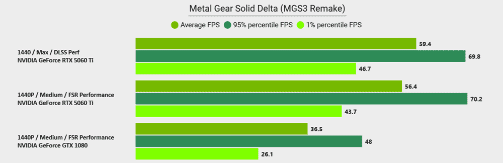 Metal Gear Solid Delta remake on PC is interesting – because visually, it’s damn pretty – but on a technical level, there are numerous interesting decisions, not least of which a 60FPS cap. It might therefore seem a strange candidate for a title for using to benchmark our cards, but on the GTX 1080 frame rates struggle to maintain much north of 30FPS in the early parts of the game with just the medium preset and setting FSR to performance. I will stress that you *REALLY* want to avoid dropping below medium with MGS Delta; because the visuals at low don’t just drop, they fall off a cliff.