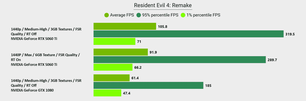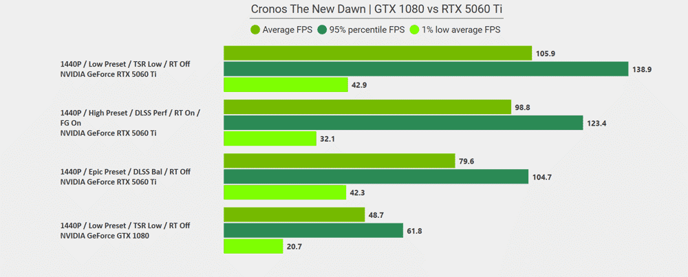 Truthfully, though – 30FPS is ‘okay’ for a game such as Cronos for me at a push, due to the nature of the beast. With careful manipulation of settings and locking the game to 30fps you could probably crank the quality settings a chunk or two. Mirroring the same settings, the RTX 5060 Ti over doubles the performance of the GTX 1080 (although the CPU is holding things back a bit).