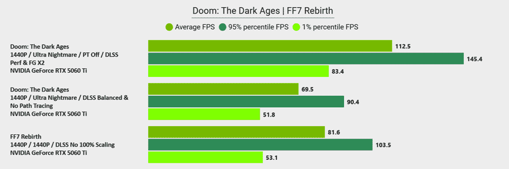 I also decided to see how well Doom: The Dark Ages and FF7 Rebirth run on our ‘I7-8700K’ powered RTX 5060 Ti, and the answer is pretty damn well. With Ultra Nightmare settings and 1440P, over 112FPS can be sustained with frame generation x2 and 70 without, using DLSS balanced. Obviously, there’s no comparison to the GTX 1080 here, because once again Pascal simply isn’t supported by either of these games.