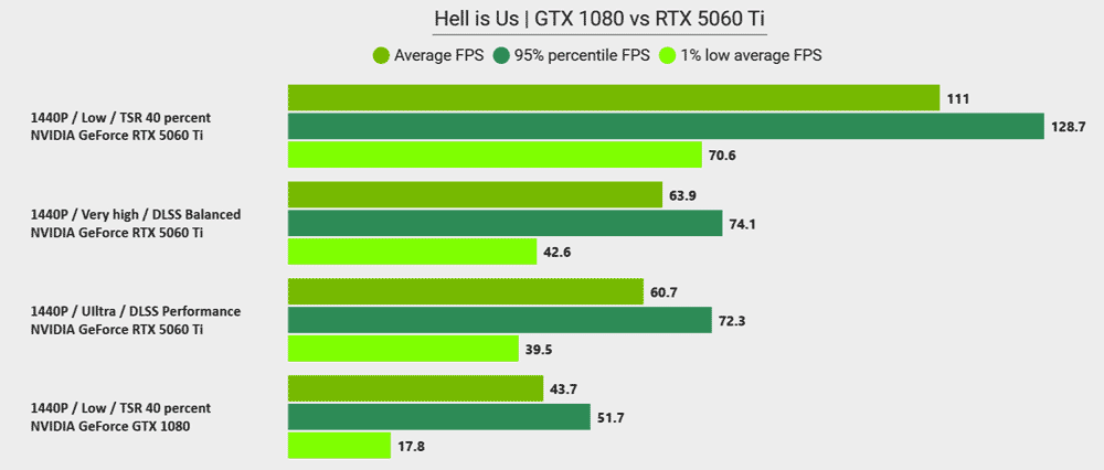 For the last game in the comparison, we have Hell is Us – once again, the RTX 5060 Ti over doubles the performance of the GTX 1080 at the lowest settings, despite the CPU definitely holding it back (at these low settings, the RTX 5060 Ti is so fast it is waiting for the CPU to keep up). 1440P is very happily playable here, with your choice really coming down to either very high vs ultra and your preferences for upscaling.