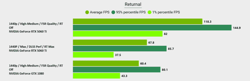 I have said this before – and I’ll say it again, Returnal is a game I am absolutely terrible at; but I keep returning too because the atmosphere and gameplay is just absolutely incredible. Anyway – again, the GTX 1080 is reasonably competent here, assuming you’re willing to stick to medium-high settings and use FSR quality. Matching those settings on the RTX 5060 Ti over doubles our FPS again, with the CPU once again being a pesky culprit.