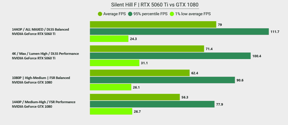 During the middle of working on this content, Silent Hill F dropped – and you can check checkout my more exhaustive content of Silent Hill F in the dedicated article where I test out performance across lower-end GPUs and also different CPU configurations too. But I happened to gather some data for the RTX 5060 Ti and the GTX 1080 in the game.