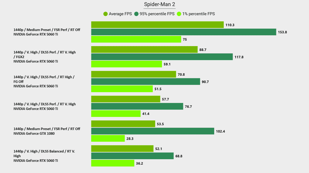 You can see therefore Spider-Man 2 runs amazingly well on the RTX 5060 Ti when ray tracing is disabled, but with it enabled problems start emerging. You could turn RT off or down to help, but frame generation actually resolves a lot of these problems. It offloads some of the CPU workload and while input latency isn’t directly solved with ‘more GPU frames’, the reduction in work on the CPU actually helps smooth over the experience by giving it more cycles to calculate AI, stream in data and do ‘stuff’ which the game world needs. Of course; this is up to you; but if I were playing the game – I’d definitely keep Frame Gen 2x on for lower CPU performance builds.