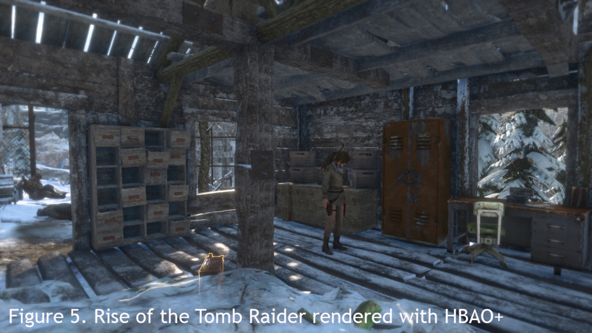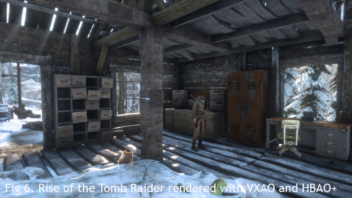 “In Rise of the Tomb Raider, not all locations benefit from VXAO equally well, and the reason for that lies in the game’s art and lighting solution. The game has separate channels for ambient lighting and ambient occlusion, and how exactly they are used is determined by materials. The ambient occlusion channel is often applied on top of direct lighting as well, and because VXAO is not a local effect and tends to add occlusion to large surfaces, some lights become dimmer.”