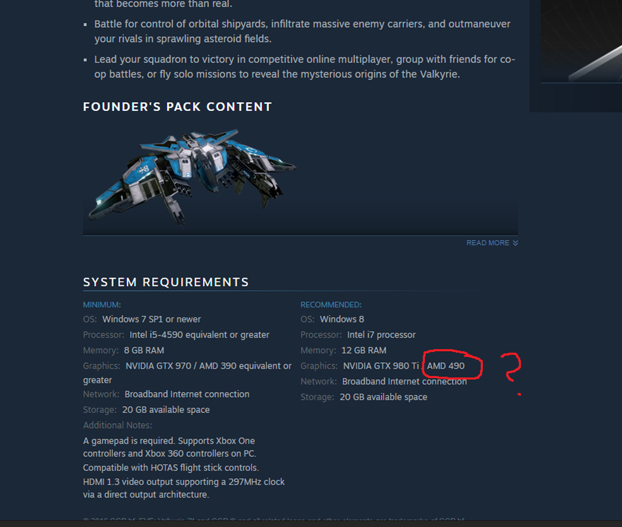 Then we have Eve Valkyrie on Steam showing as the Radeon 490 as a recommended graphics card. So the mystery (will for now) have to remain unaswered,