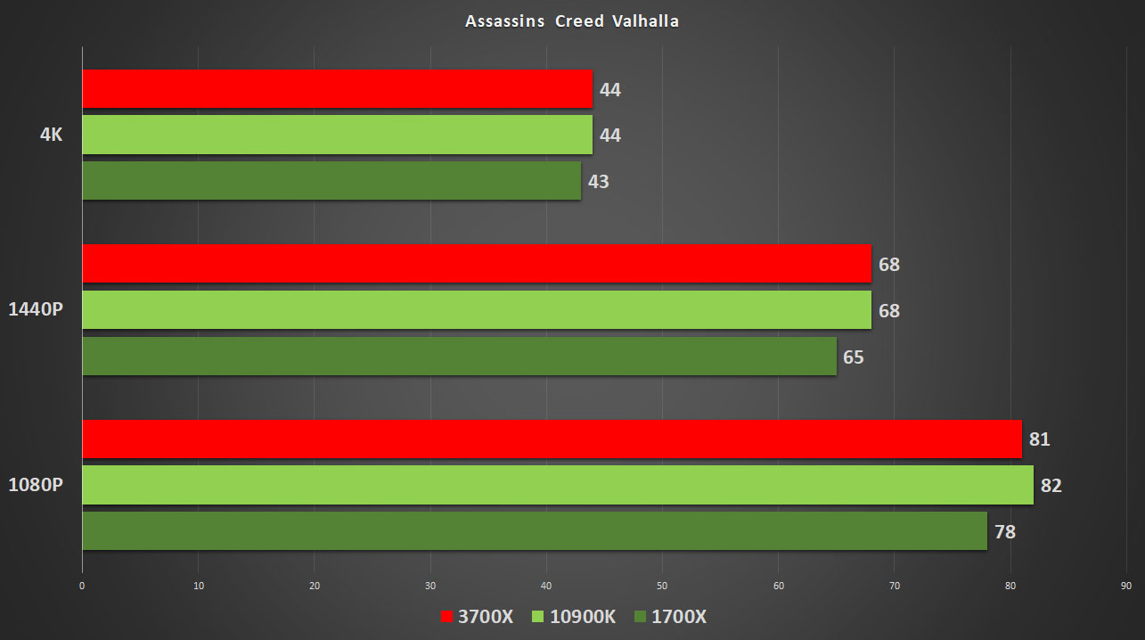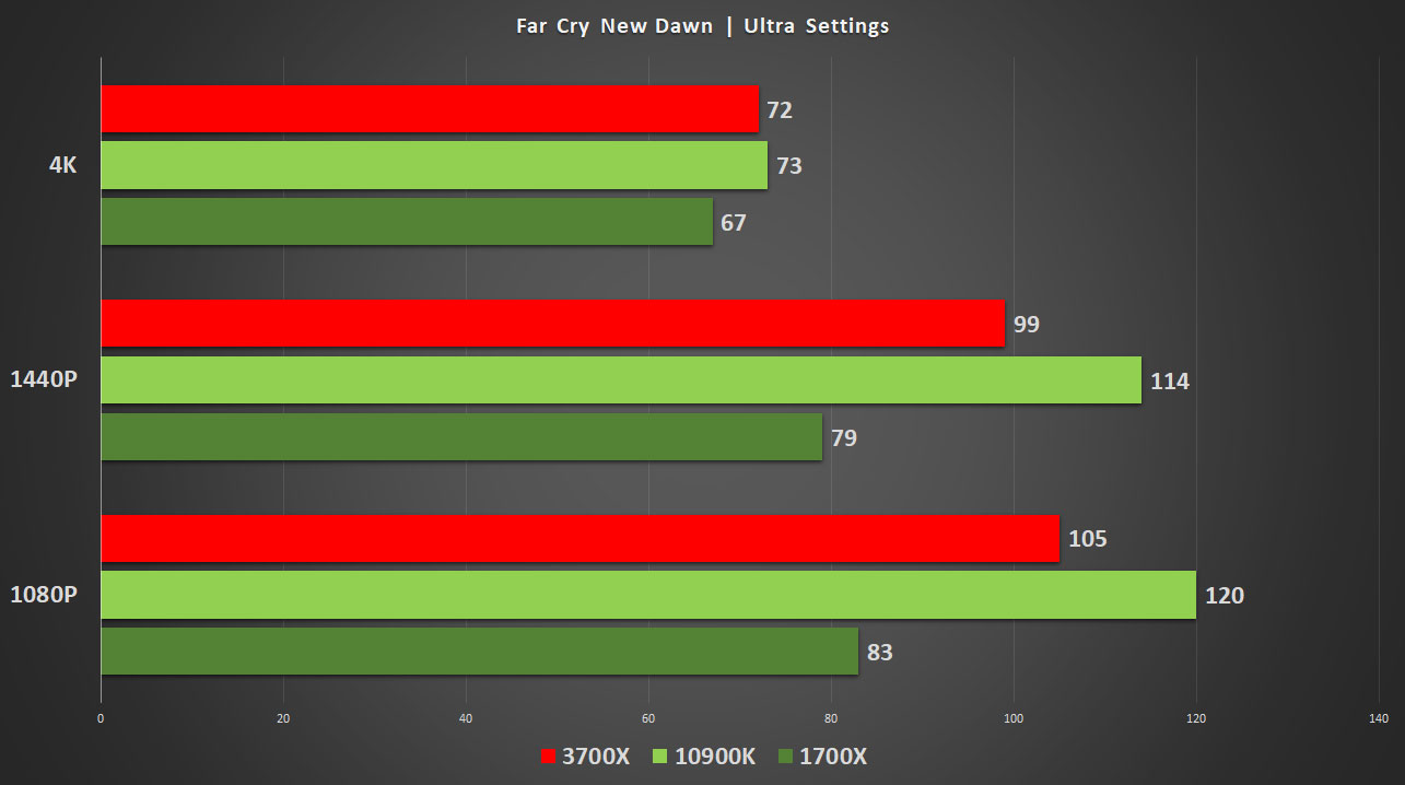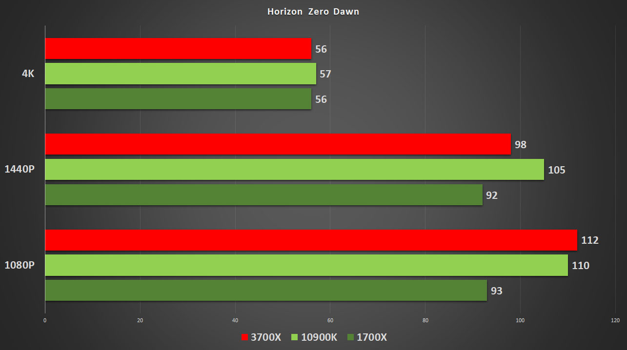 You’d be hard-pressed to tell the CPU running Horizon Zero Dawn like almost any game here, if you’re cranking the resolution to 4K. Lower resolutions show that the Ryzen 7 3700X actually slightly edges the Intel I0-10900K here (with the Intel processor running at stock and not overclocked).