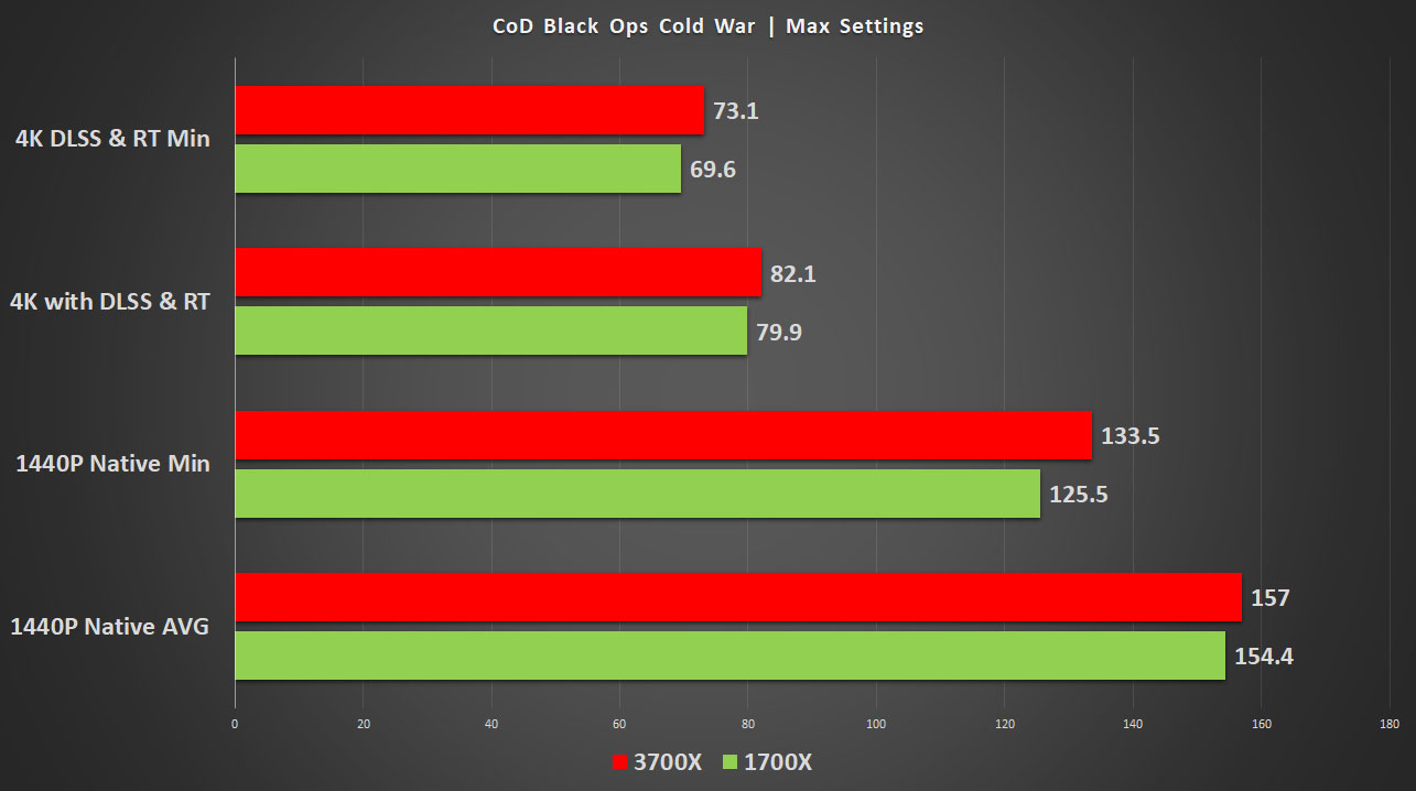 A lot of data in our COD Black Ops Cold War results, but at 1440P Native Resolution, with no Ray Tracing, the Ryzen 7 1700X is more than capable of hitting 120Hz refresh and we’re regularly finding the GPU is the limiting factor. Ray Tracing is ultra demanding here, and with DLSS to help balance it out, we’re comfortable over the 60FPS mark.