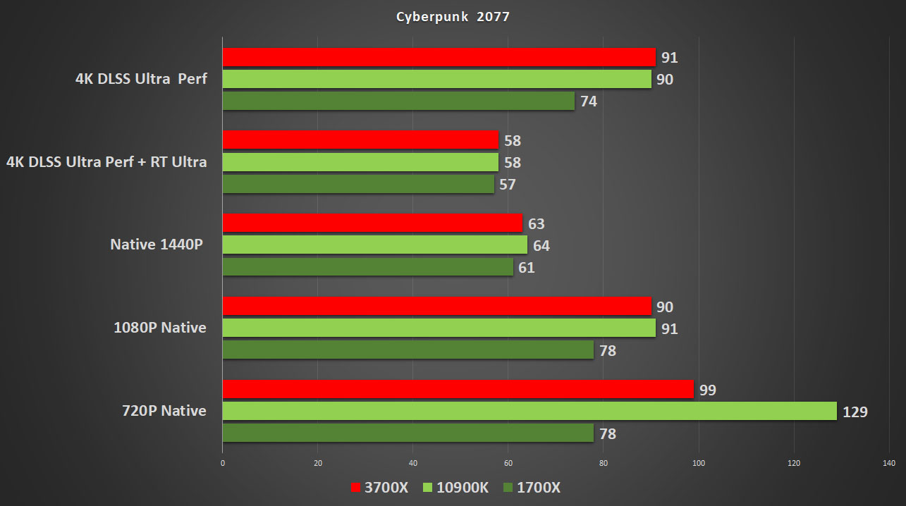 Finally, we have Cyberpunk, and I threw in 720P results here, because the game just hits GPUs (and well, everything) so hard. As of the time I am putting this together, the game is still pretty buggy, and performance updates are incoming from the developers which means these results might be out-of-date in a few months. For those who want a great Cyberpunk experience, it’s critical to have at least 6 CPU cores and a decent GPU. If you’re running a lower end Nvidia RTX based card, for higher frame rates, DLSS is a no-brainer, though the game looks amazing with Ray Tracing, but it’s of course a huge performance impact.