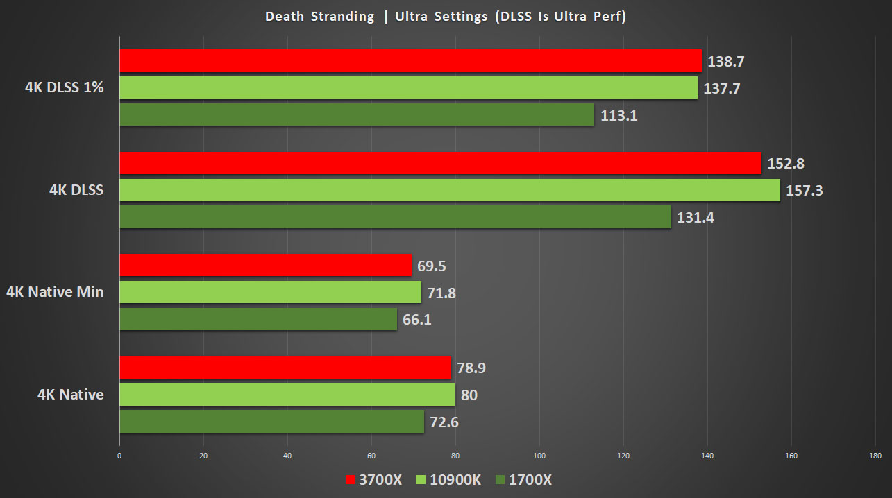 For Death Stranding, we run a manual section right near the beginning of the game which is easily repeatable. Again, the first generation Ryzen CPU is certainly not a slouch, but minimum frame rates are noticeably lower than the Zen 2 based silicon. A Ryzen 7 3700X seems to pair rather well with a graphics card in the same kind of calibre as the GeForce RTX 3070 or the RX 6800.