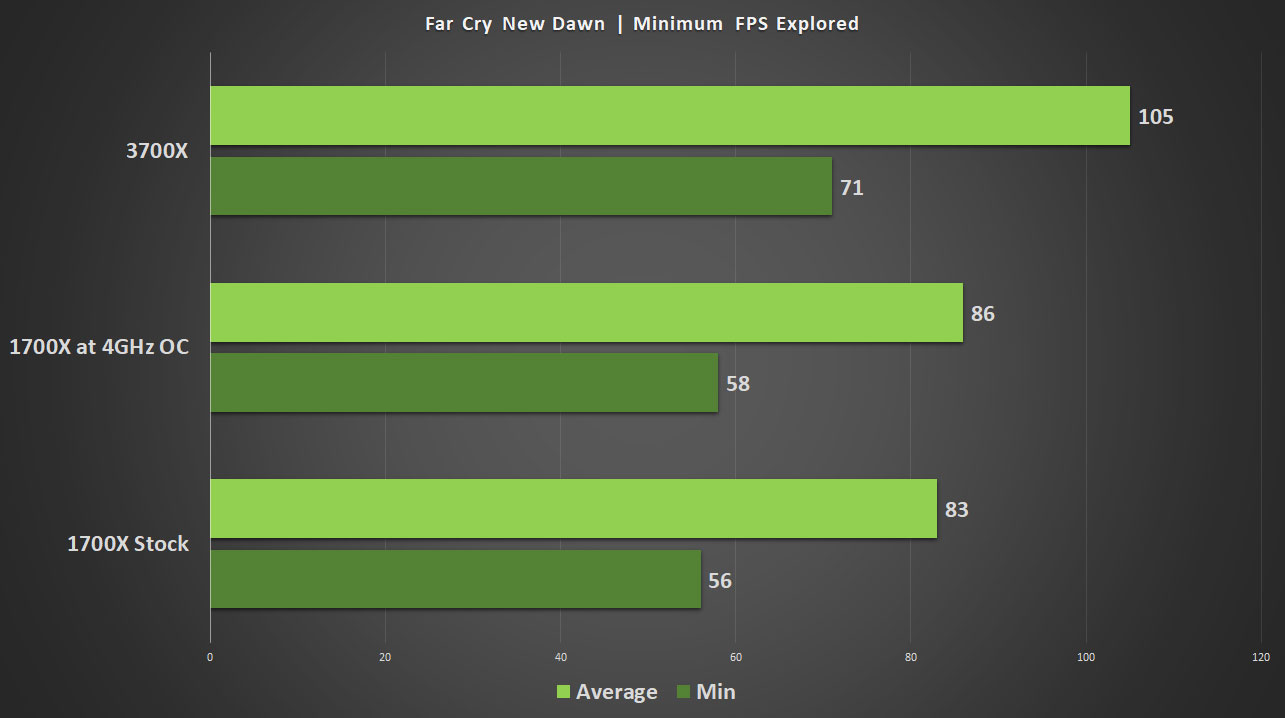 Far Cry New Dawn is a punishing title, and here there’s little doubt that Zen 2 offers a sizable advantage over the first gen. You’ll notice that the min FPS for Far Cry for the 1700X didn’t even hit 60FPS, meaning that frame rate dips were definitely possible when things were hectic. Thankfully, this isn’t quite the case for the 3700X, which was enough to drive both the average and min frame rates up comfortably.