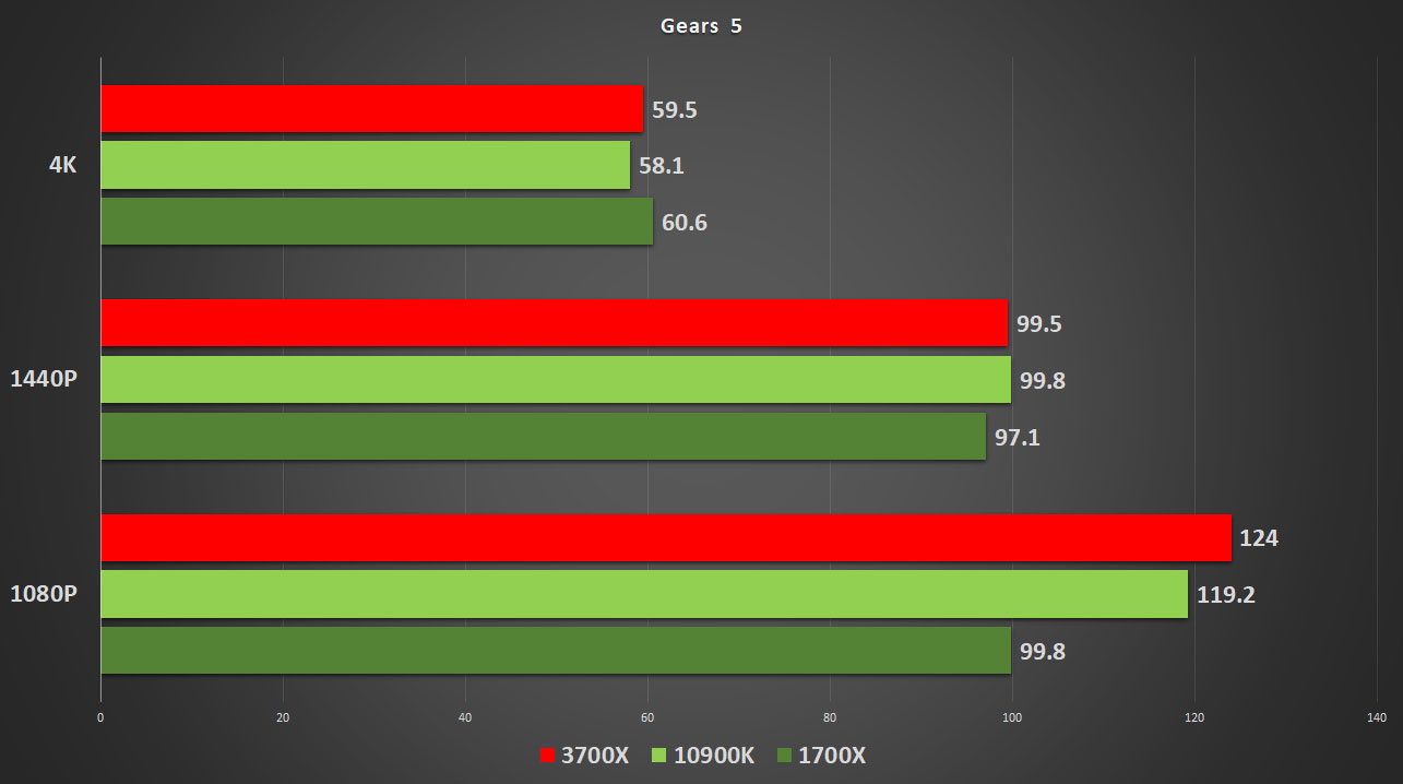 The rest of our data shows very similar trends, Gears 5 offers just over a 20 percent leap in performance from Zen 1 to Zen 2 when the GPU isn’t the limiting factor, and this gap starts to narrow as resolution bumps up. In this side by side gameplay here between the 1700X and 3700X, you can see the differences in the earlier section of the game, running at 1080P.
