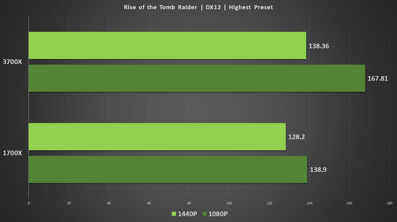 We see a 30FPS gain from using the Zen 2 architecture at just 1080P, but despite ROTR being a game dating back to 2015, it was still very punishing to GPUs, and our RTX 3070 starts to push the limits at 1440P.