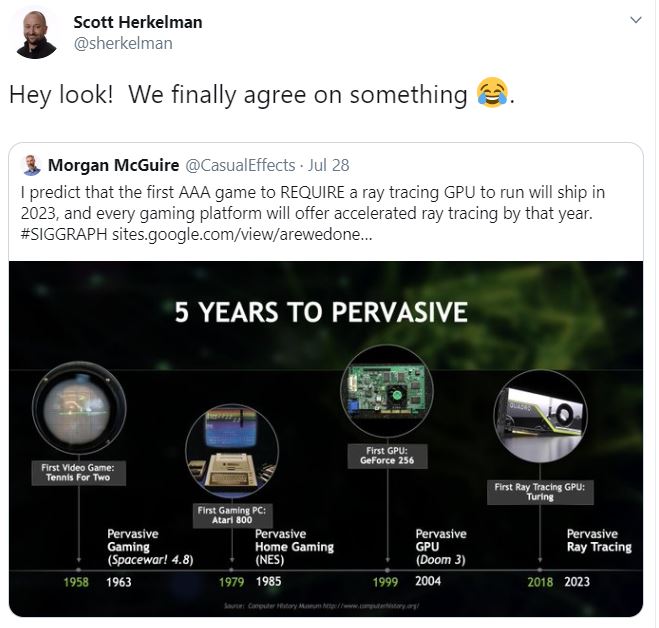 Finally, and a bit of a bonus tidbit – AMD’s Scott Herkelman (Mr Jebaited) has recently ‘agreed’ with Nvidia’s Morgan McGuire that Ray Tracing will indeed be a requirement for graphics cards by the year 2023.