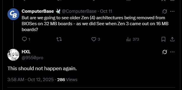 HXL also went on to assuage concerns that we could see older CPUs being removed from support as we discussed above, but thankfully he was quick to state that we should not see a repeat of history here as we did see Zen 4 support being removed on 32MB motherboards when Zen 3 released.